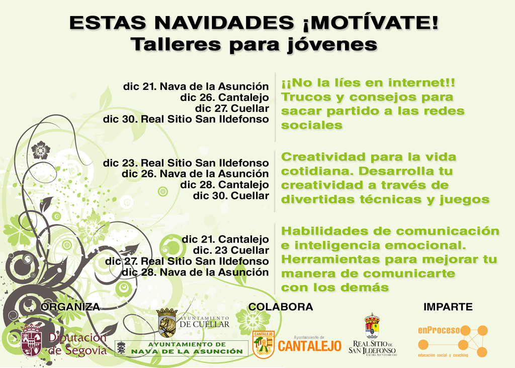 "Creatividad para la vida cotidiana" se impartirá en La Granja el 23 de diciembre; en Nava de la Asunción el 26, en Cantalejo el 28 y en Cuéllar el 30. "Habilidades de comunicación" llegará a Cantalejo el 21, a Cuéllar el 23, al Real Sitio de San Ildefonso el 27 y a Nava de la Asunción el 28. Y "!No te líes en Internet! se impartirá el 21 en Nava de la Asunción, el 26 en Cantalejo, el 27 en Cuéllar y el 30 en el Real Sitio de San Ildefonso.